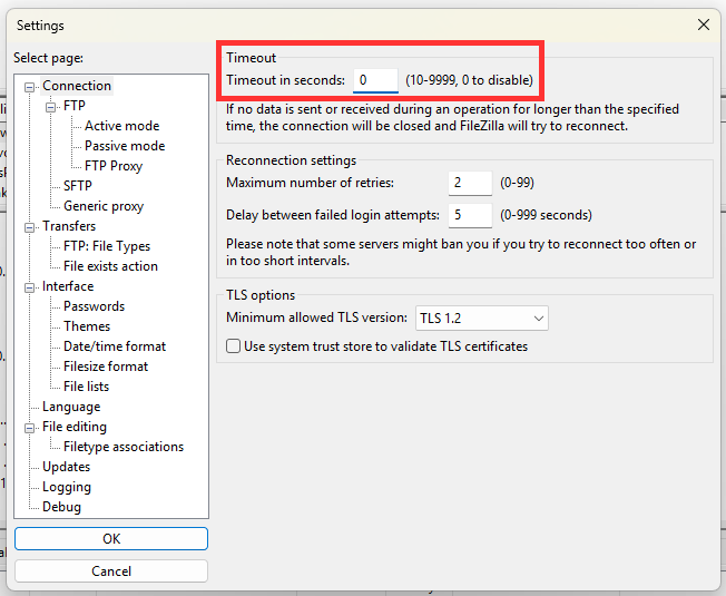 3. Increase Timeout in seconds to 0 and select OK