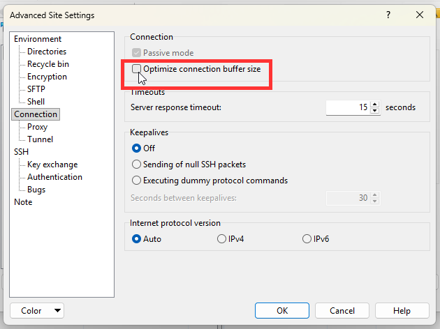 3. Uncheck "Optimize connection buffer size"
