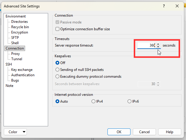 4. Increase the "Server response timeout" to 360 seconds