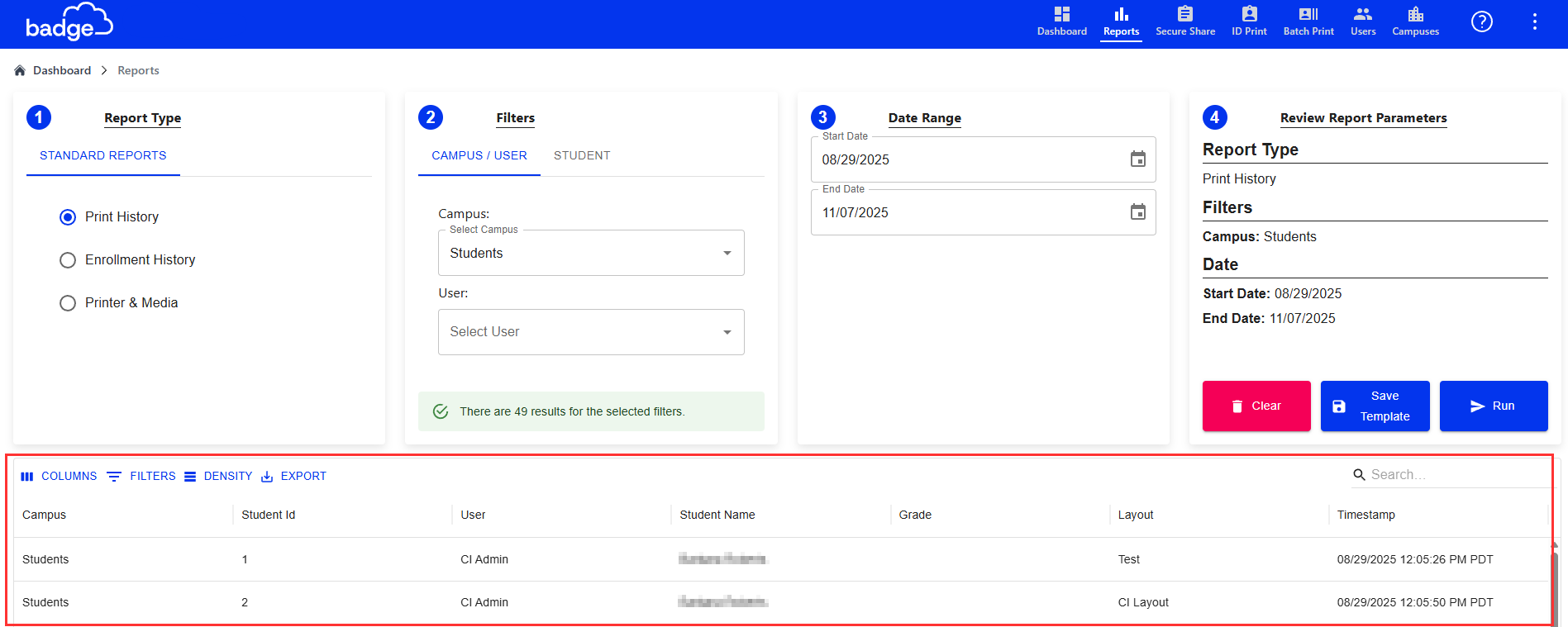 In Reports, Badge Owners/Operators can create and export reports to save in the computer. Badge Operators can only run and view reports of ID cards they specifically printed. Badge Owners have full access to view and run reports for all lists and records.