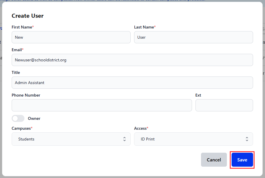 - Campus selection indicates the User's access to student and staff information for each campus.