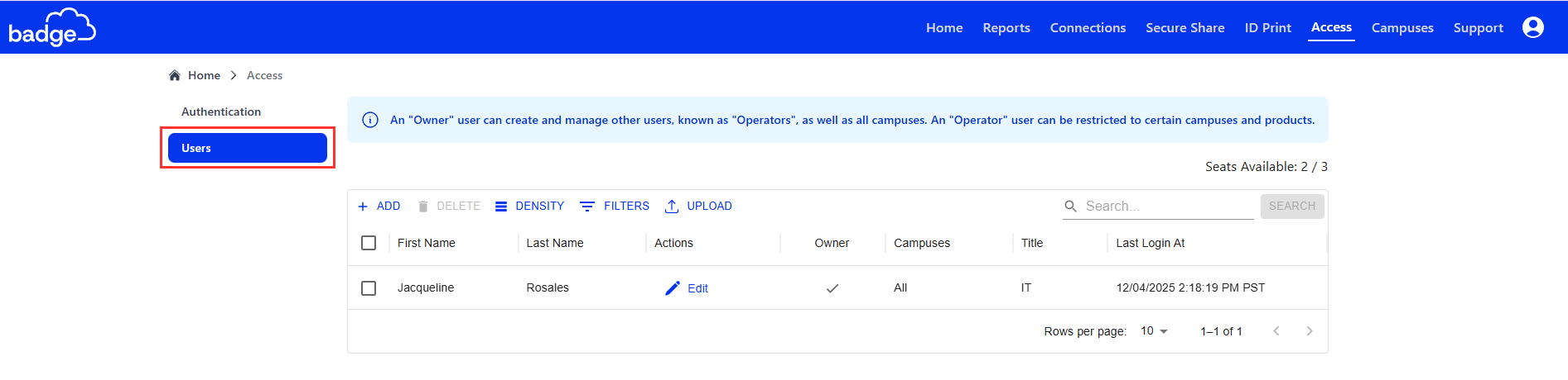 Owners can either individually add Users or upload a CSV file to import a collection of Users to Badge.- If you are unsure who are the Badge Owners, contact us or your team members for account information.