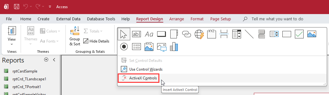 1. Go to Report Design and expand the Controls, select ActiveX Controls