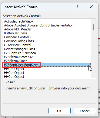 2. In the Insert ActiveX Control window, select EZBFontSizer.FontSizer