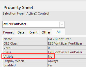 2. After pasting the axEZBFontSizer, the Visible option in the Property Sheet needs to be updated to No