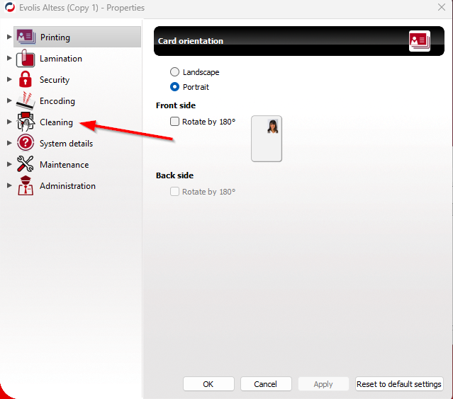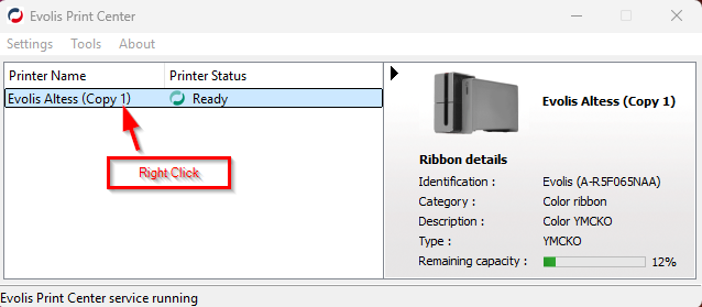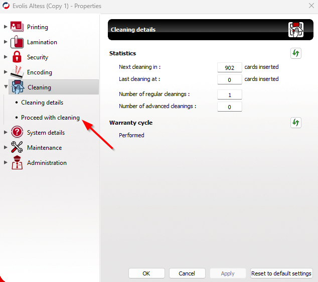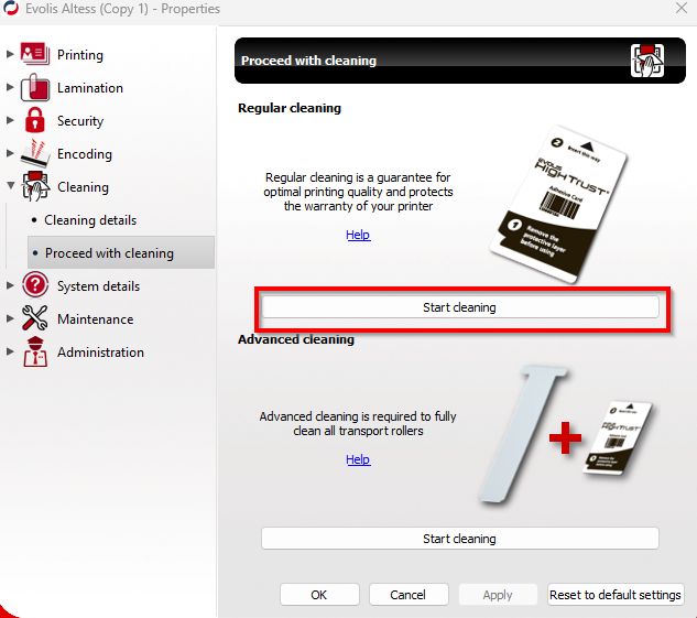 1. Open the Evolis Print Center app > Right-click on your printer > Properties > Cleaning > Proceed with Cleaning > Start Cleaning