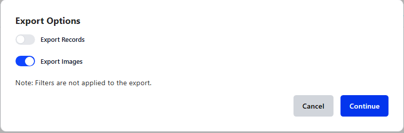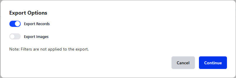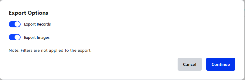 Records and Images are toggled to be exported by default. If you want to export Records and Images, leave the settings to default.Export Records