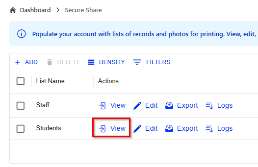 2. Find the List Name (e.g., school, staff, district, office) you want to view > Click VIEW