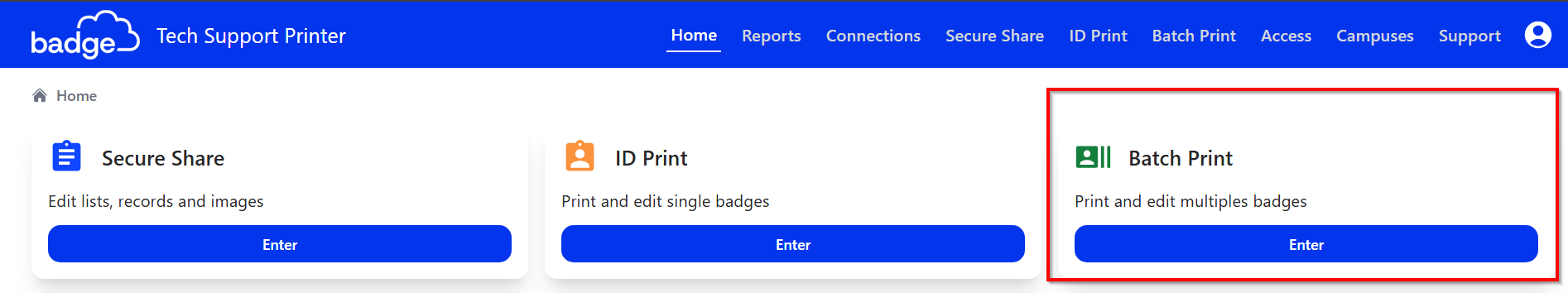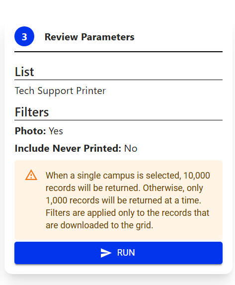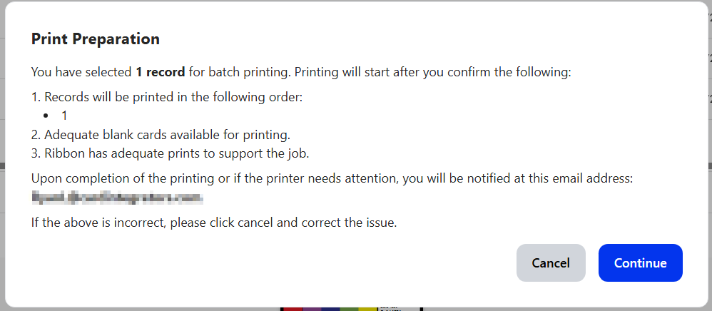 WARNING: The button CANCEL BATCH PRINT may result in print and enroll errors dependent on the physical card printing process and should be taken with precaution. It is crucial to check every Batch Print Job email sent to clients to ensure ID Cards, Badge, and any third-party SIS match. e.g., There can be cases where a Batch Print job is cancelled while a card is in the process of printing and can fail to enroll a RFID value in the uid. While the card completed printing, the enrollment process may have cancelled, resulting in an ID card without an uid value.
