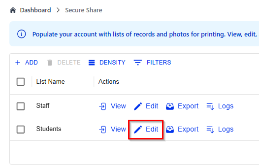 2. Find the List Name (e.g., school, staff, district, office) you want to view > Click Edit